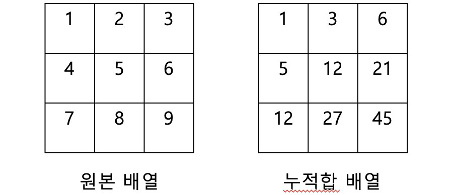 원본 배열에 따른 누적합 배열은 위와 같다. (1,1)을 기준으로 특정 좌표까지의 합을 저장한 것이 누적합 배열이다.