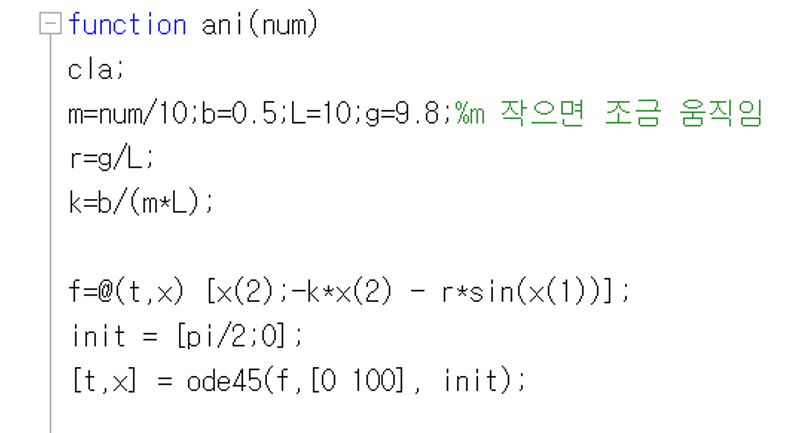 f는 진자운동을 위한 연립 방정식, init은 초기 조건이다. ode45 함수는 연립 미분방정식 y' = f(t, x)를 적분해준다.