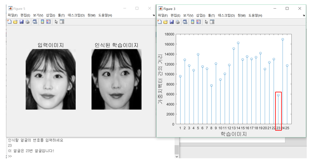 새로 입력된 이미지도 가중치 벡터를 계산하여 학습 가중치 벡터와 입력 가중치 벡터 간의 거리를 계산한다. 이 값이 작은 이미지가 가장 유사한 얼굴이다.